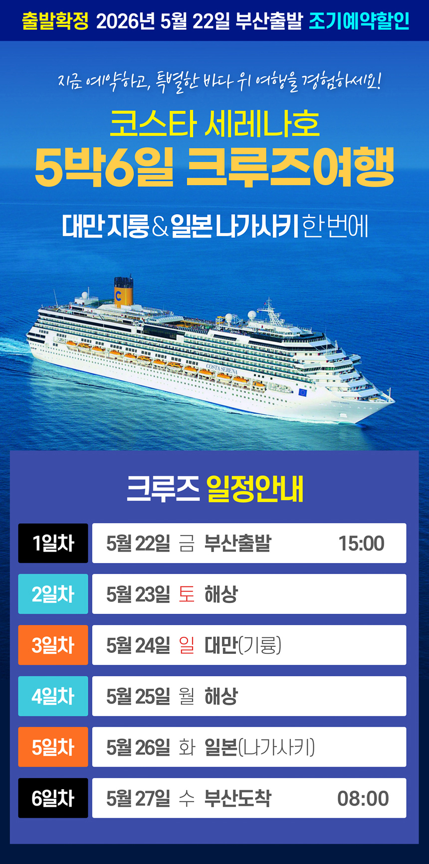 ÄÚ½ºÅ¸Å©·çÁî 5¹Ú6ÀÏ ´ë¸¸/ÀϺ»Å©·çÁî¿©Çà ¡¤ 1Â÷ : ~11¿ù30ÀϱîÁö ¿¹¾àÇϽô °í°´´Ôµé : 30¸¸¿ø/ÀÎ ÇÒÀÎ